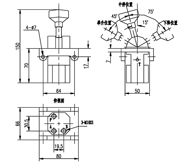 ¡¡¡¡®”(d¨¡ng)ÊÖ±úÔÚ¡°ÖÐÍ£¡±Î»ÖÕr, P¿ÚêP(gu¨¡n)é], A¡¢B¿Ú²»¹¤×÷£»®”(d¨¡ng)ÊÖ±úÔÚ¡°ÅeÉý¡±Î»ÖÕr,P¿ÚÅcA¿ÚÏàͨ,B¿Ú²»¹¤×÷£»®”(d¨¡ng)ÊÖ±úÔÚ¡°Ï½µ¡±Î»ÖÕr£¬P¿ÚÅcB¿ÚÏàͨ£¬P¿ÚÅcA¿ÚÏàͨ,A¿Ú²»¹¤×÷¡£