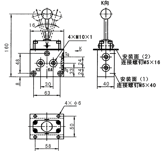 用途與特征: 2KQF型操縱氣閥是切換多路氣控閥氣缸的操縱氣閥。搬動手柄可在二個不同位置分別控制多路閥工作。具有其重量輕,體積小,對環(huán)境無污染,靈敏度高得多等優(yōu)點。是5噸位以上自卸汽車氣路控制的一種理想元件。2KQF型操縱氣閥的原始位置Pq口與T口是封閉的,各控制口K與Tq口相通。搬動手柄可在二個不同角度。