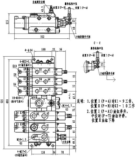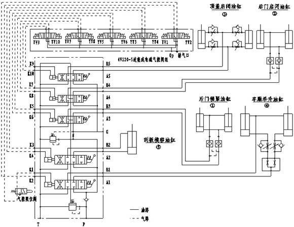 工作泵(舉升泵)供油進入QSF-L20H型組合換向閥后,通過氣控(手動)操作換向閥切換油路,實現(xiàn)對不同執(zhí)行元件(油缸)的控制。當執(zhí)行元件(油缸)需要大流量的液壓油進行工作時,用油管與該組合閥中進油閥體與分流閥體之間的換向閥體進行連接,工作泵(舉升泵)輸出的液壓油將全流量通過換向閥進入執(zhí)行機構(油缸);當執(zhí)行元件(油缸)需要小流量的液壓油進行工作時,用油管與該組合閥中分流閥體后面的換向閥體進行連接,工作泵(舉升泵)輸入的液壓油經(jīng)分流閥后分流出一部分(30L/Min)通過換向閥進入執(zhí)行機構(油缸),剩余的液壓油直接流回油箱。