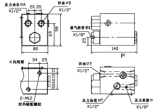 EQ340氣控分配閥是常開式二位四通換向閥與直動(dòng)式溢流閥的復(fù)合。可用于一切有壓縮空氣源的工程機(jī)械、運(yùn)輸機(jī)械等的液壓系統(tǒng)中,能可靠地控制工作油缸的舉升,有效地防止液壓系統(tǒng)過載,實(shí)現(xiàn)系統(tǒng)卸荷,起到安全、節(jié)能作用。有氣控信號(hào)時(shí),二位四通換向閥換向,P與T斷開與A接通,系統(tǒng)在溢流閥限定壓下工作,溢流閥起安全作用。無氣控信號(hào)時(shí),換向閥在彈簧作用下復(fù)位,P、A與T接通,系統(tǒng)卸荷。