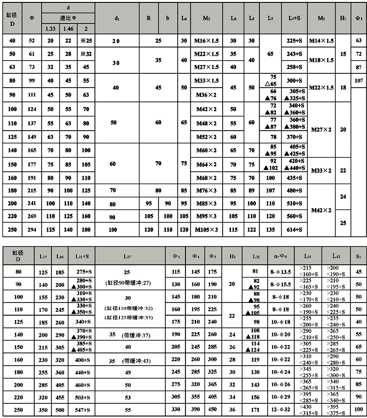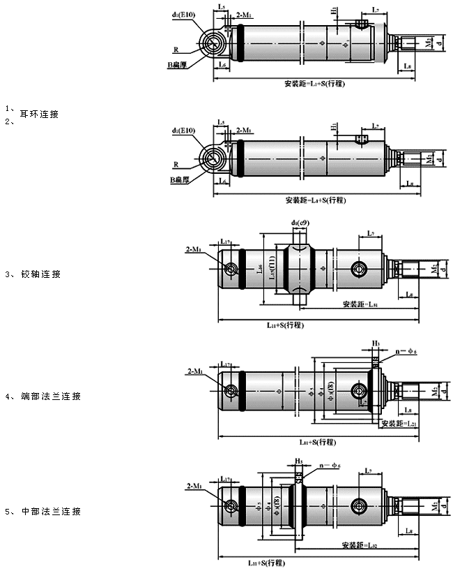 外形安裝連接尺寸: 1.活塞桿端為外螺紋連接 :